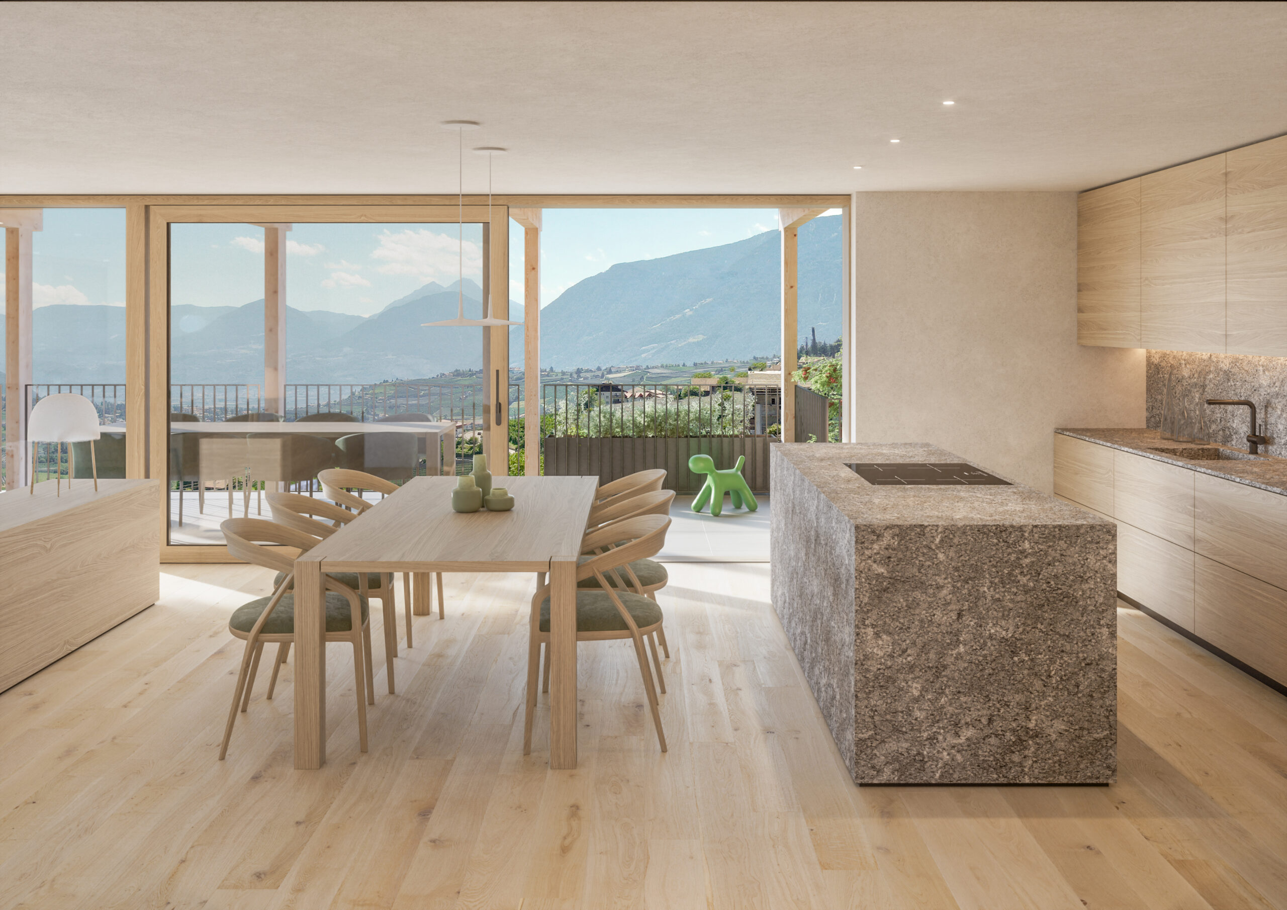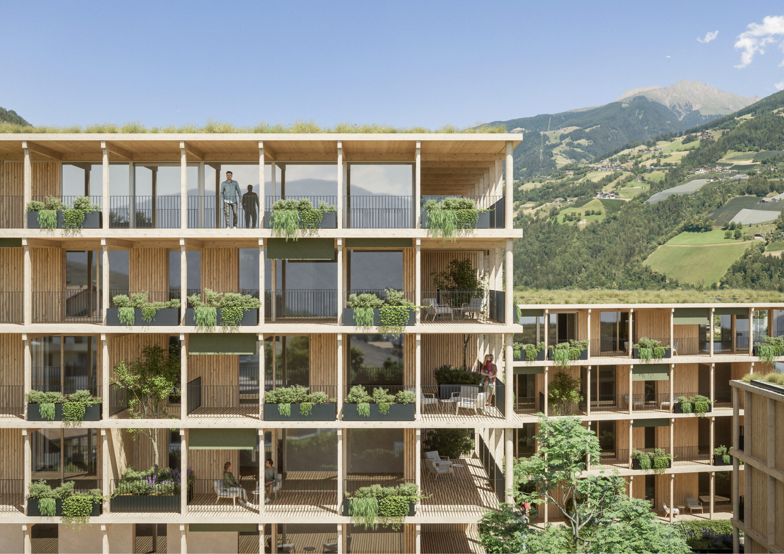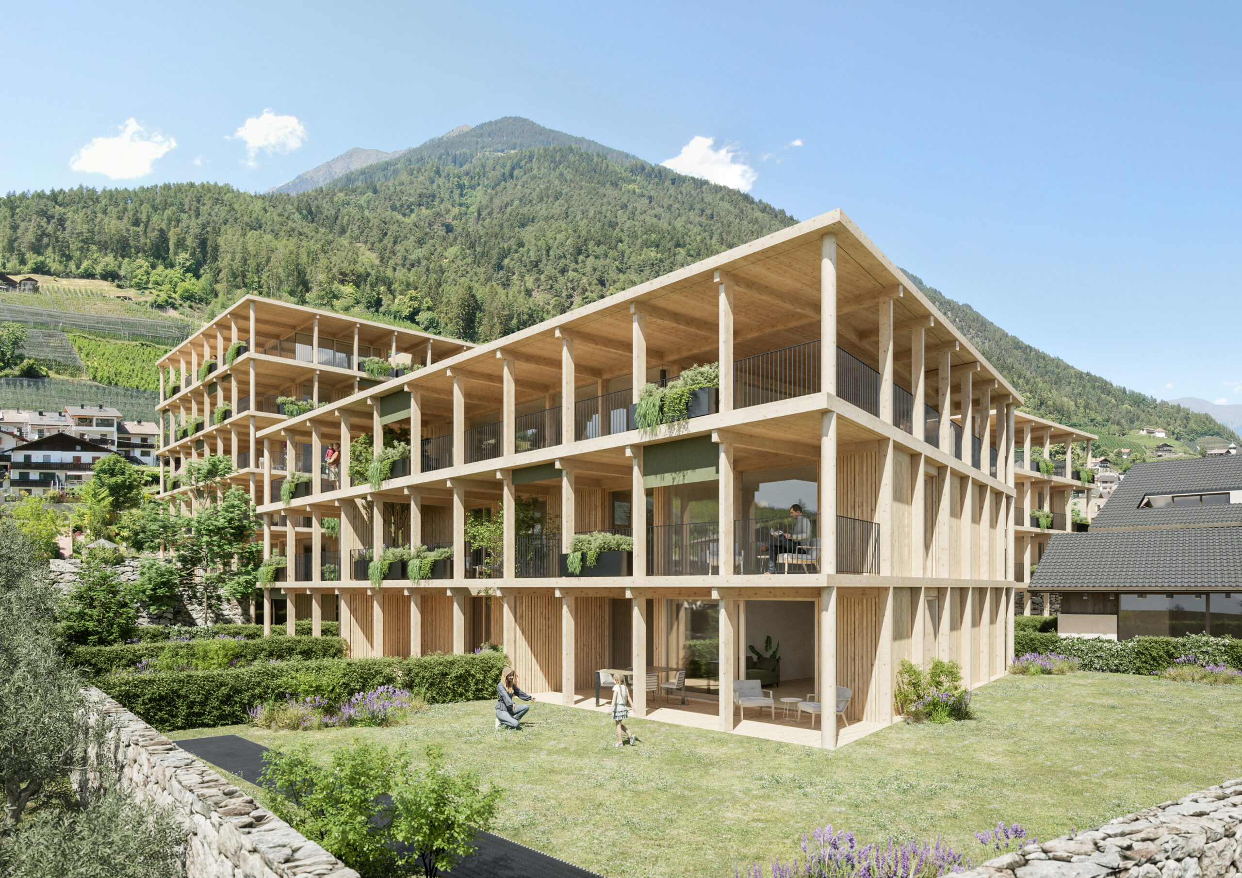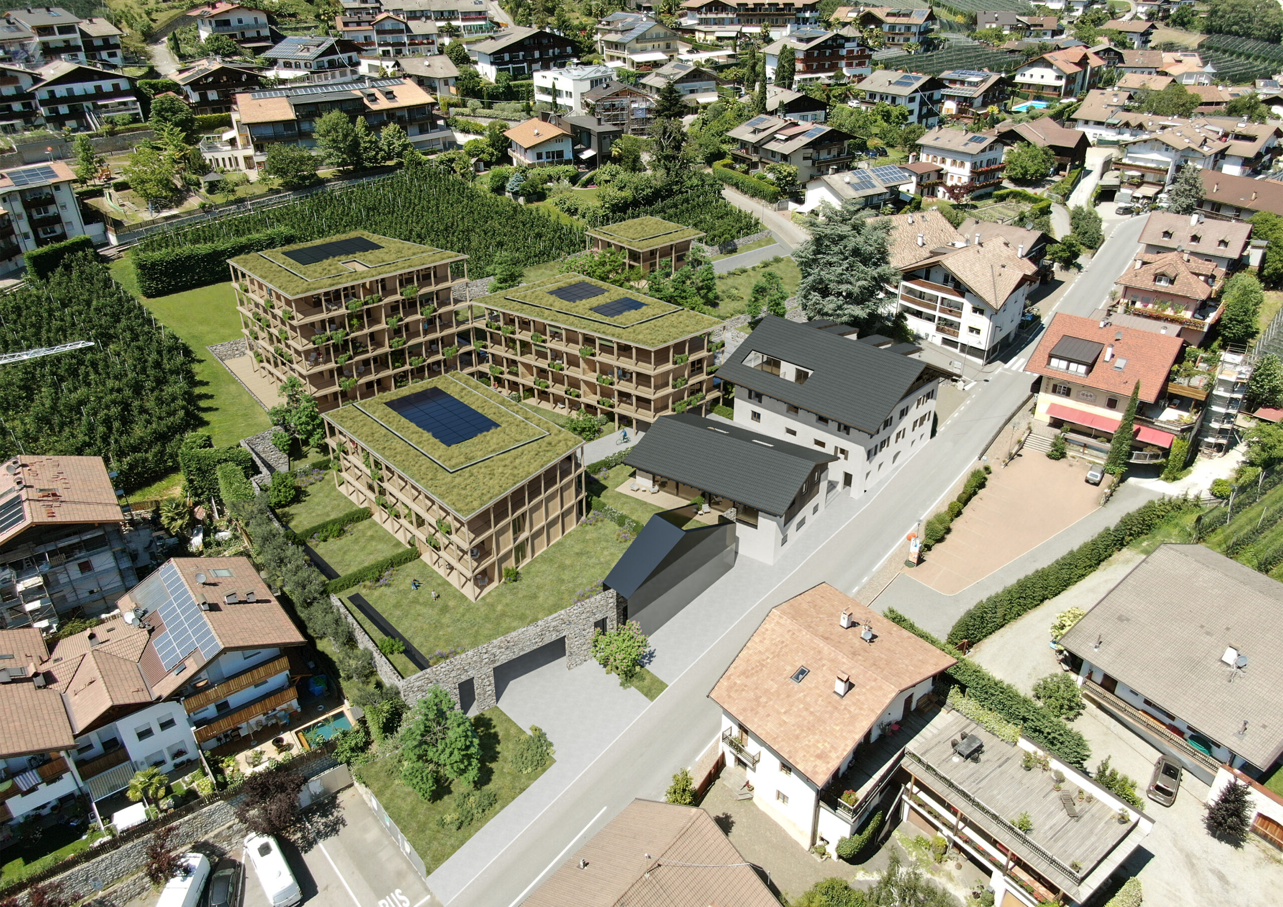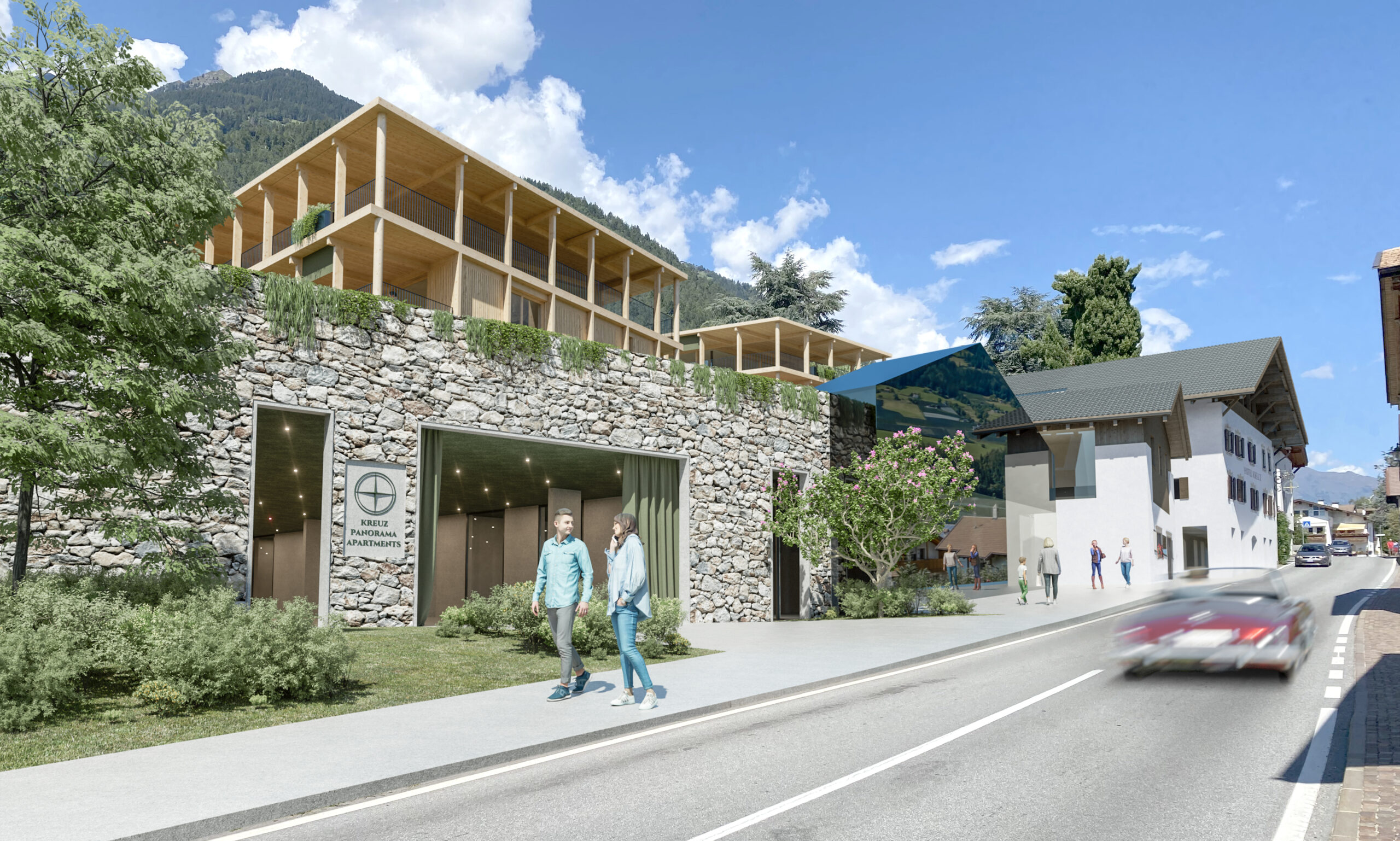 Im Ortszentrum von Riffian, einer kleinen Gemeinde in Norditalien, soll in Hanglage ein neuer Wohnkomplex mit 37 Wohnungen entstehen. Am unteren Grundstückrand befinden sich zwei historische Gebäude entlang einer starkfrequentierten Straße, das „Gasthaus Kreuz“ sowie ein dazugehörender Stadel.