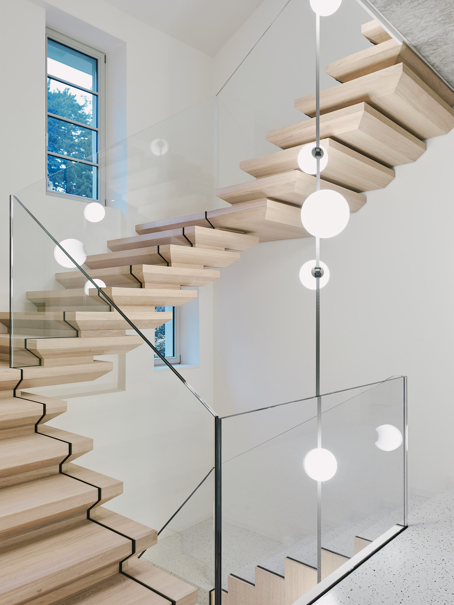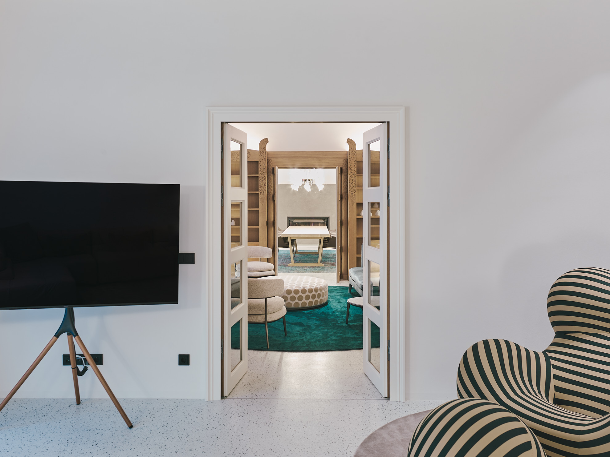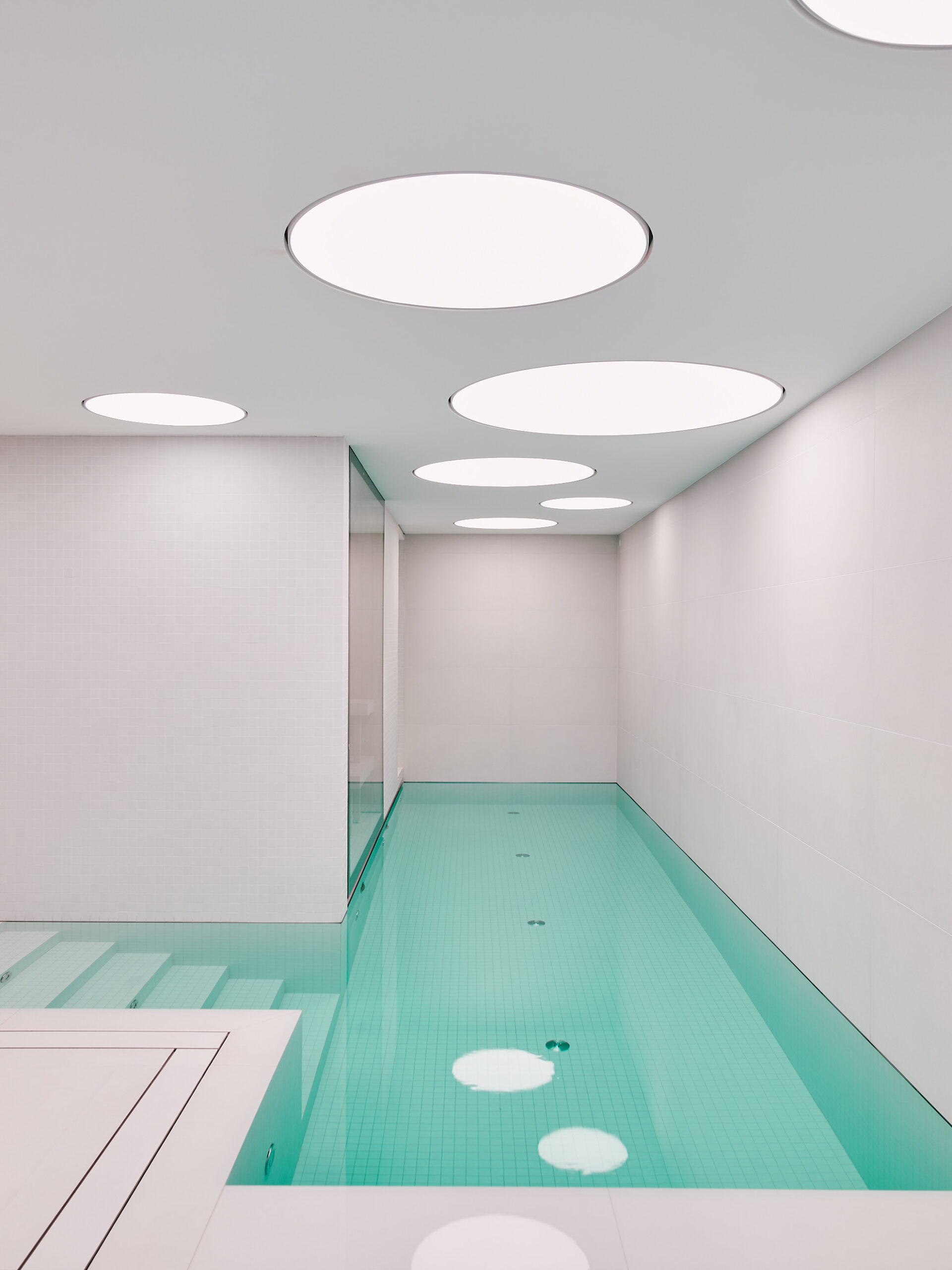 Im Erdgeschoss liegen die Hauptschlafzimmer mit direktem Zugang zum Garten, Fitness- und Spa-Bereich mit Sauna, Dampfbad und großem Innenpool, inszeniert durch farbige Deckenscheiben. Eine schwebende Holz-Glas-Treppe, beleuchtet von der Plusminus-Kaskade von Vibia, wird zum zentralen architektonischen Element.