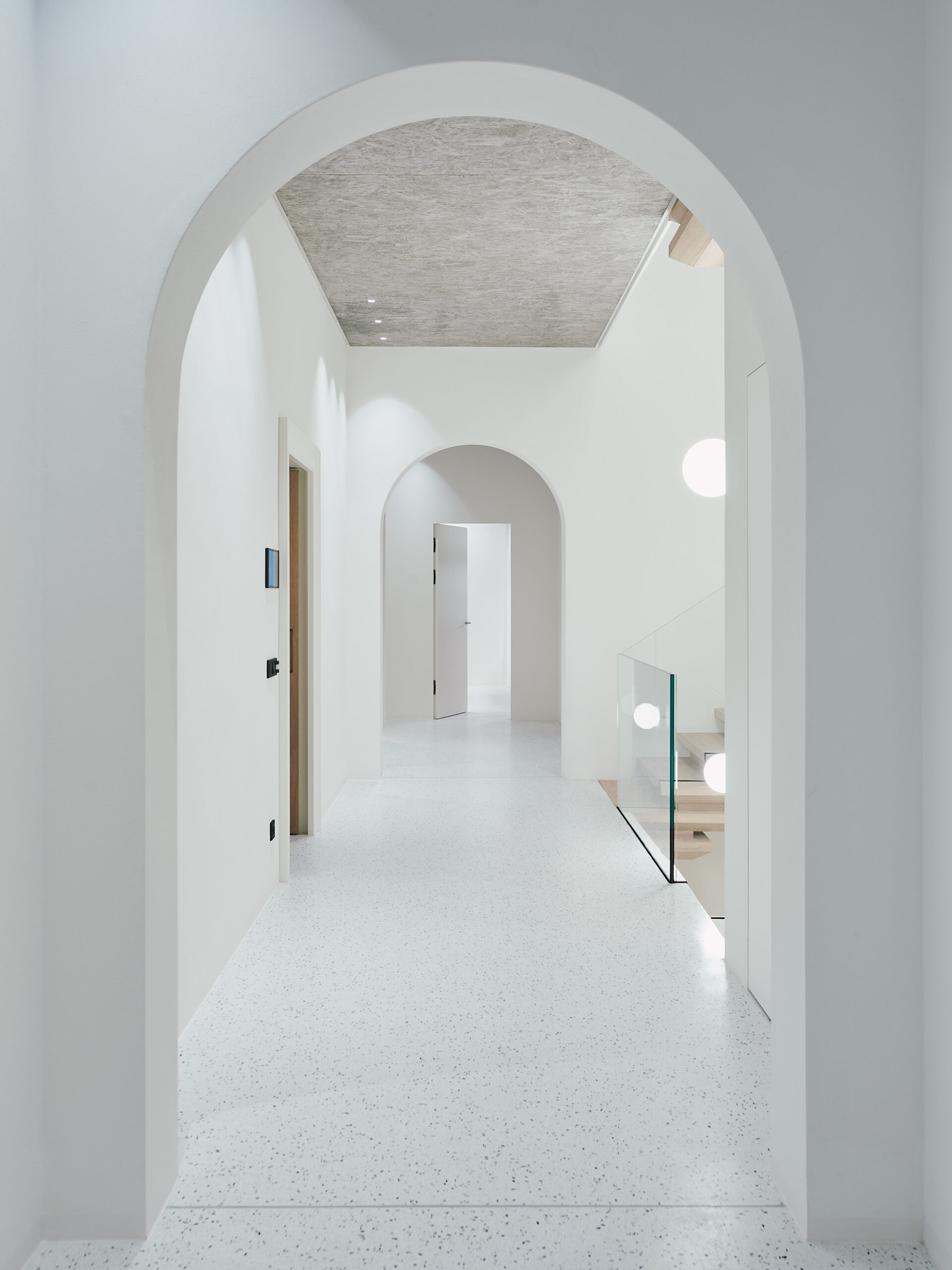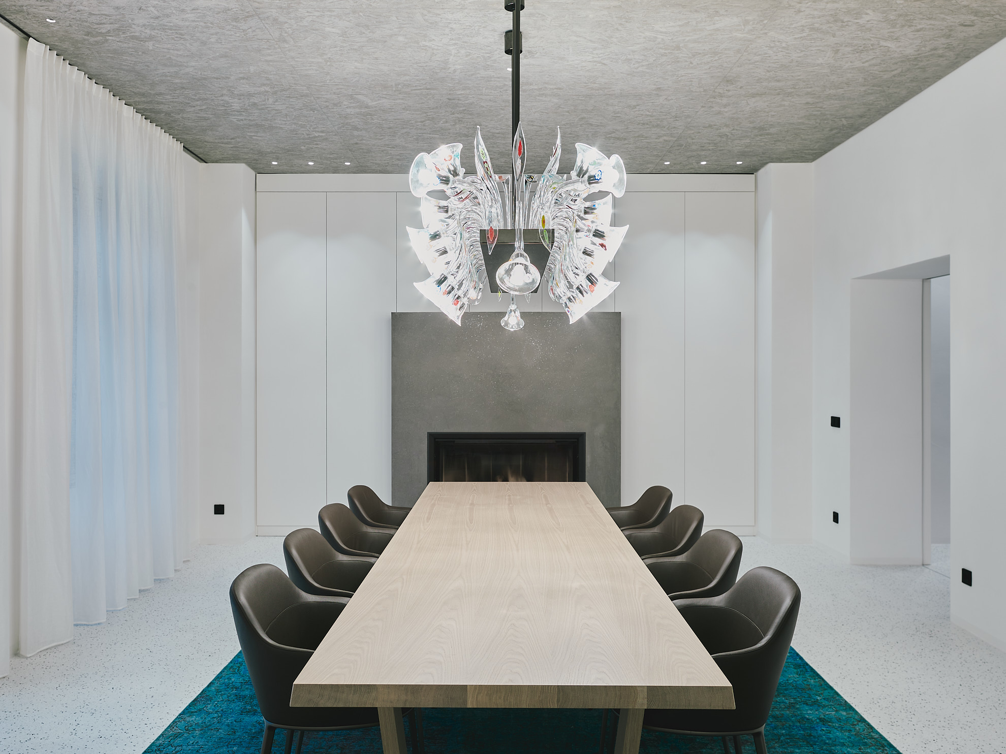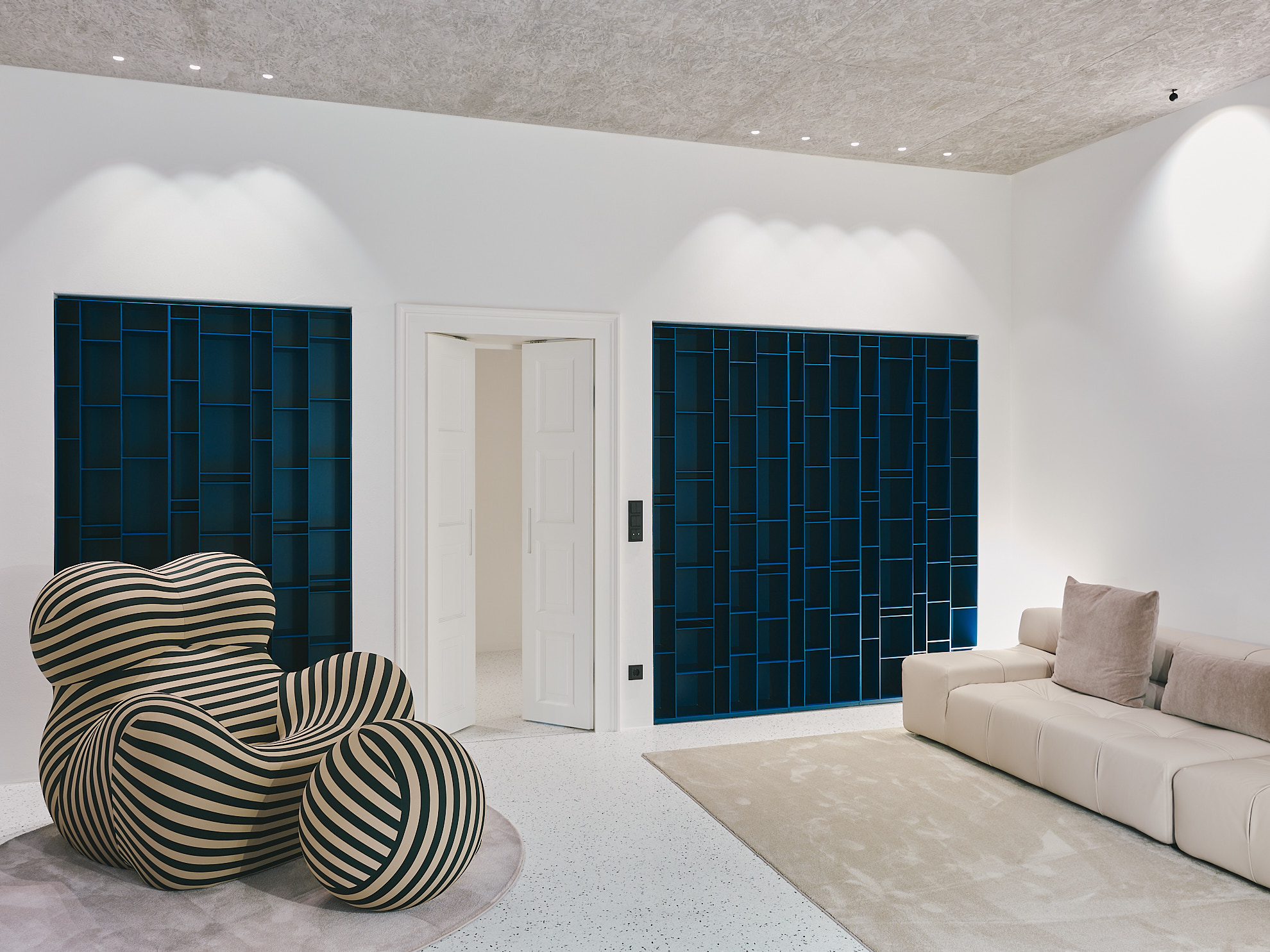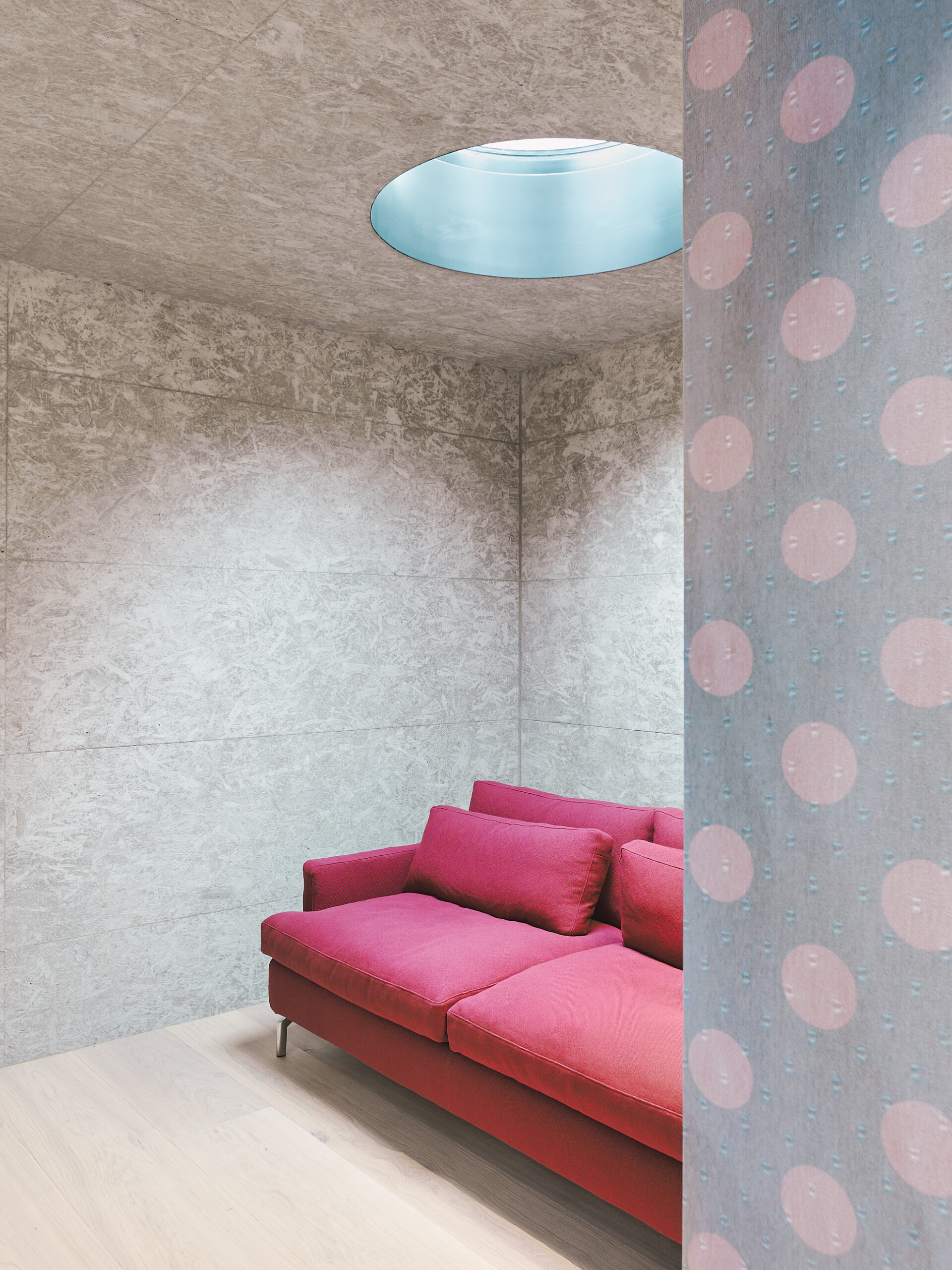 Im Erdgeschoss liegen die Hauptschlafzimmer mit direktem Zugang zum Garten, Fitness- und Spa-Bereich mit Sauna, Dampfbad und großem Innenpool, inszeniert durch farbige Deckenscheiben. Eine schwebende Holz-Glas-Treppe, beleuchtet von der Plusminus-Kaskade von Vibia, wird zum zentralen architektonischen Element.