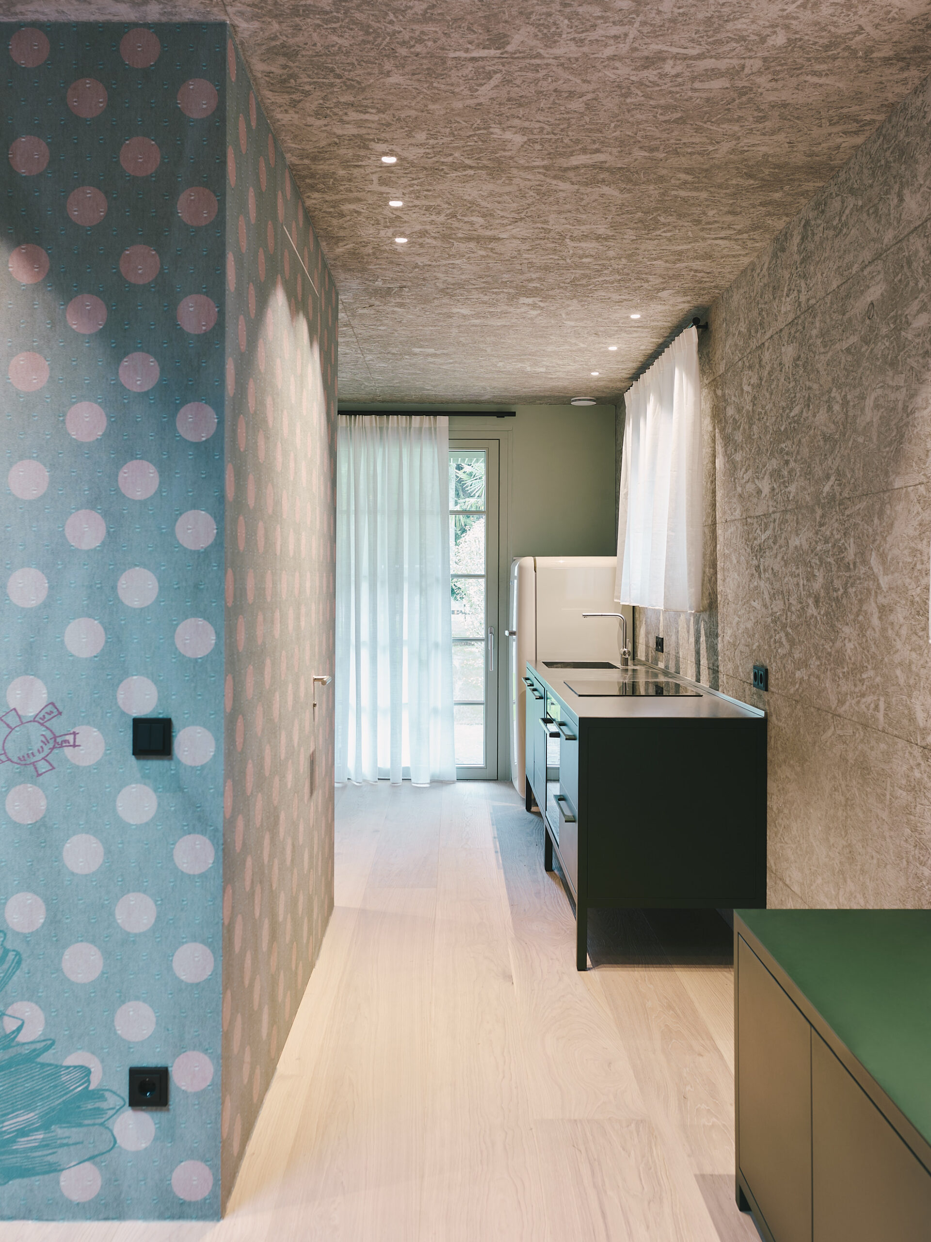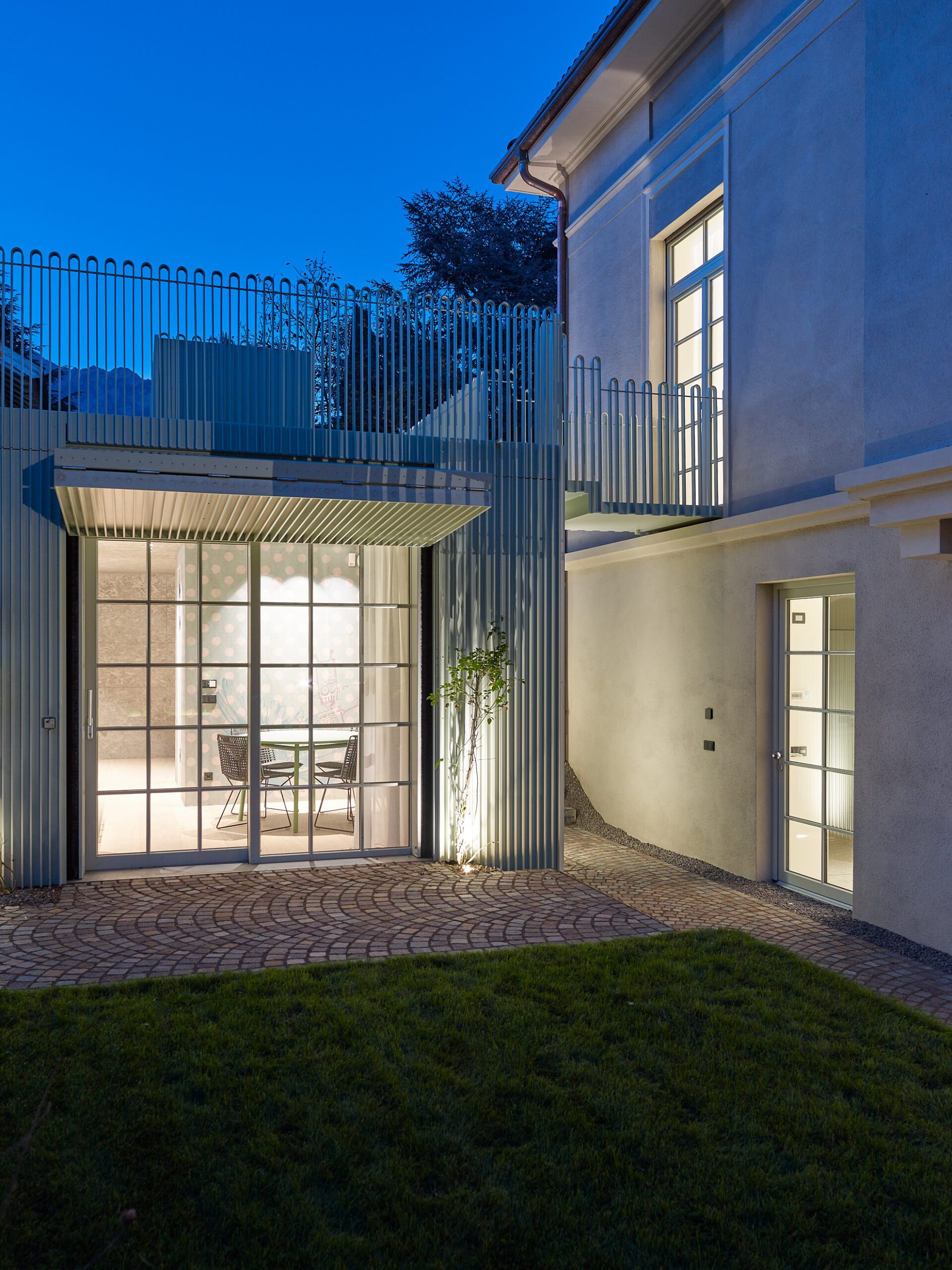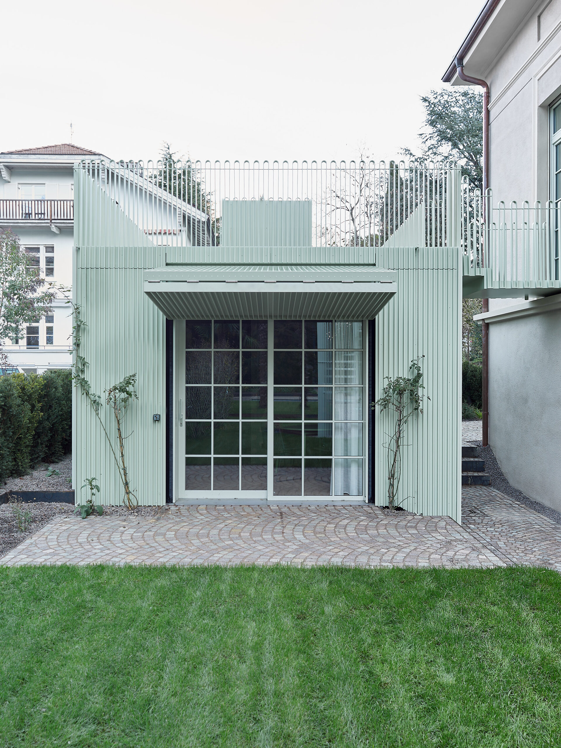 Funktionale Ergänzungen wie zwei externe Treppenvolumen treten respektvoll und zurückhaltend an das bestehende Gebäude heran. Jede neue Intervention ist bewusst lesbar, reversibel und zeitgenössisch, ohne mit der historischen Substanz zu konkurrieren. Die ehemalige Garage wird zu einer eigenständigen mintgrünen Gästedependance, die mit der Villa verbunden ist, und spielt durch Türen und Fenster subtil auf ihre ursprüngliche Funktion an.