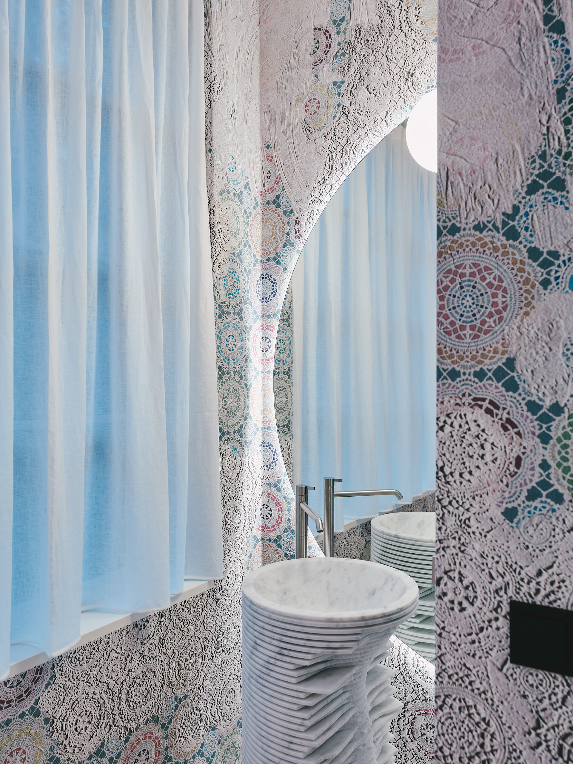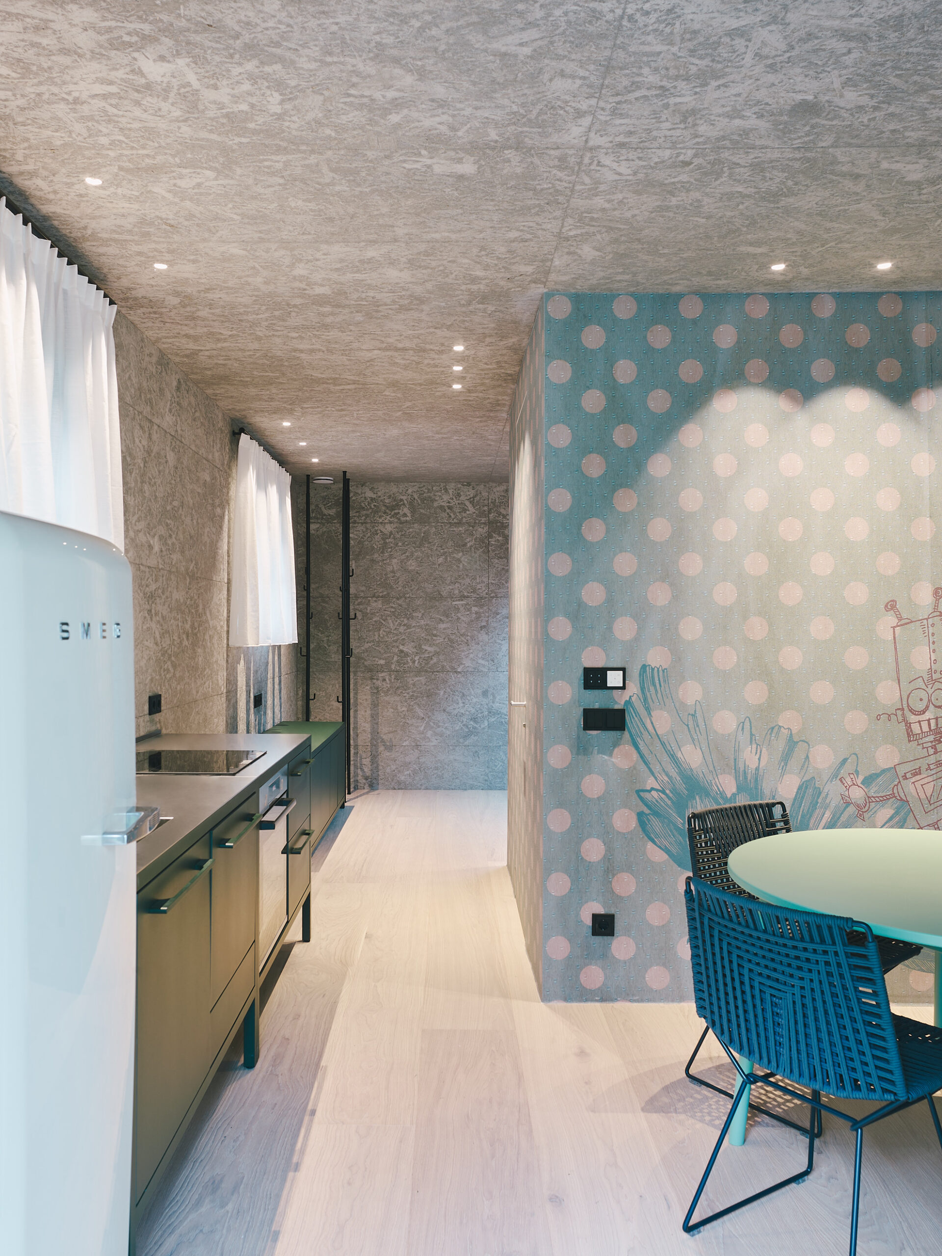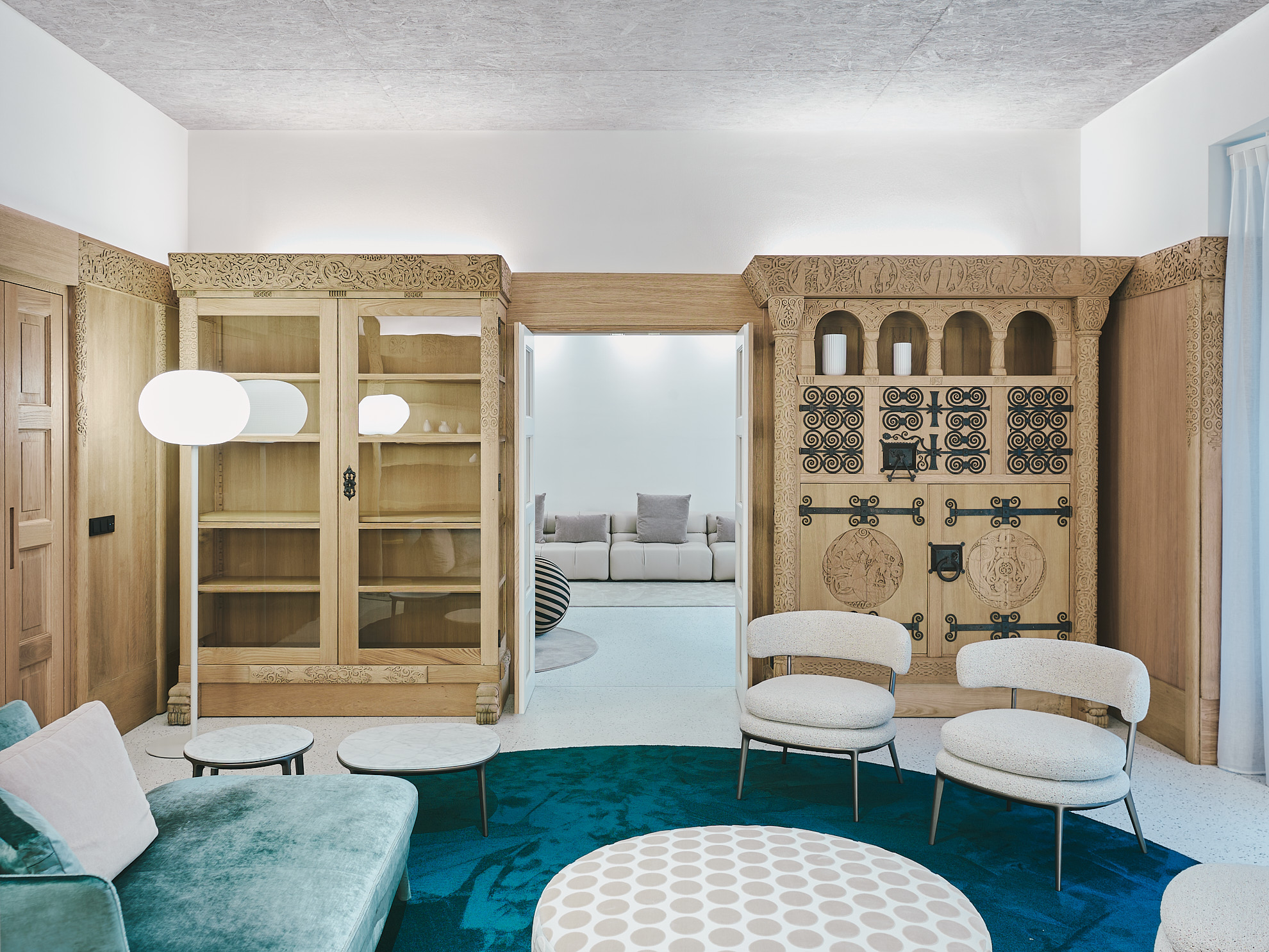 Die Innenräume kombinieren Alt und Neu. Weiße Wände verstärken Licht und Leichtigkeit. Historische Tiroler Holzvertäfelungen treffen auf moderne Tapeten, Sichtbetondecken und ikonische Designobjekte von Gaetano Pesce, Antonio Lupi und handgeblasene Murano-Kronleuchter schaffen ein stilvolles und lebendiges Ambiente. Die Farbpalette mit Aqua-Grün, Nachtblau und Petrol verbindet Innenräume und Außenanlagen harmonisch.