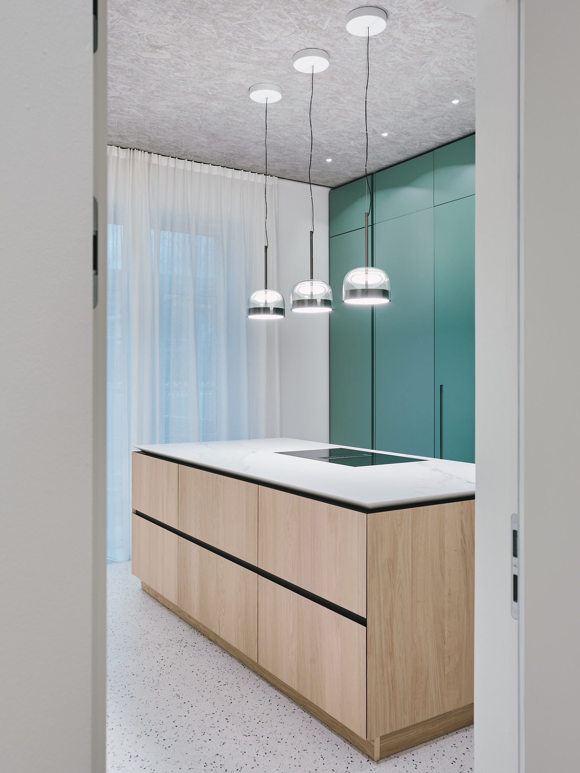 Die Materialität folgt derselben Philosophie. Der Putz wird in einem zarten Cremeton neu interpretiert, der mit den hellgrünen Lärchenholzfenstern und metallischen Details harmoniert. Diese Details erinnern an bekannte Gebäude der Stadt, wie die Wandelhalle an der Innpromenade.