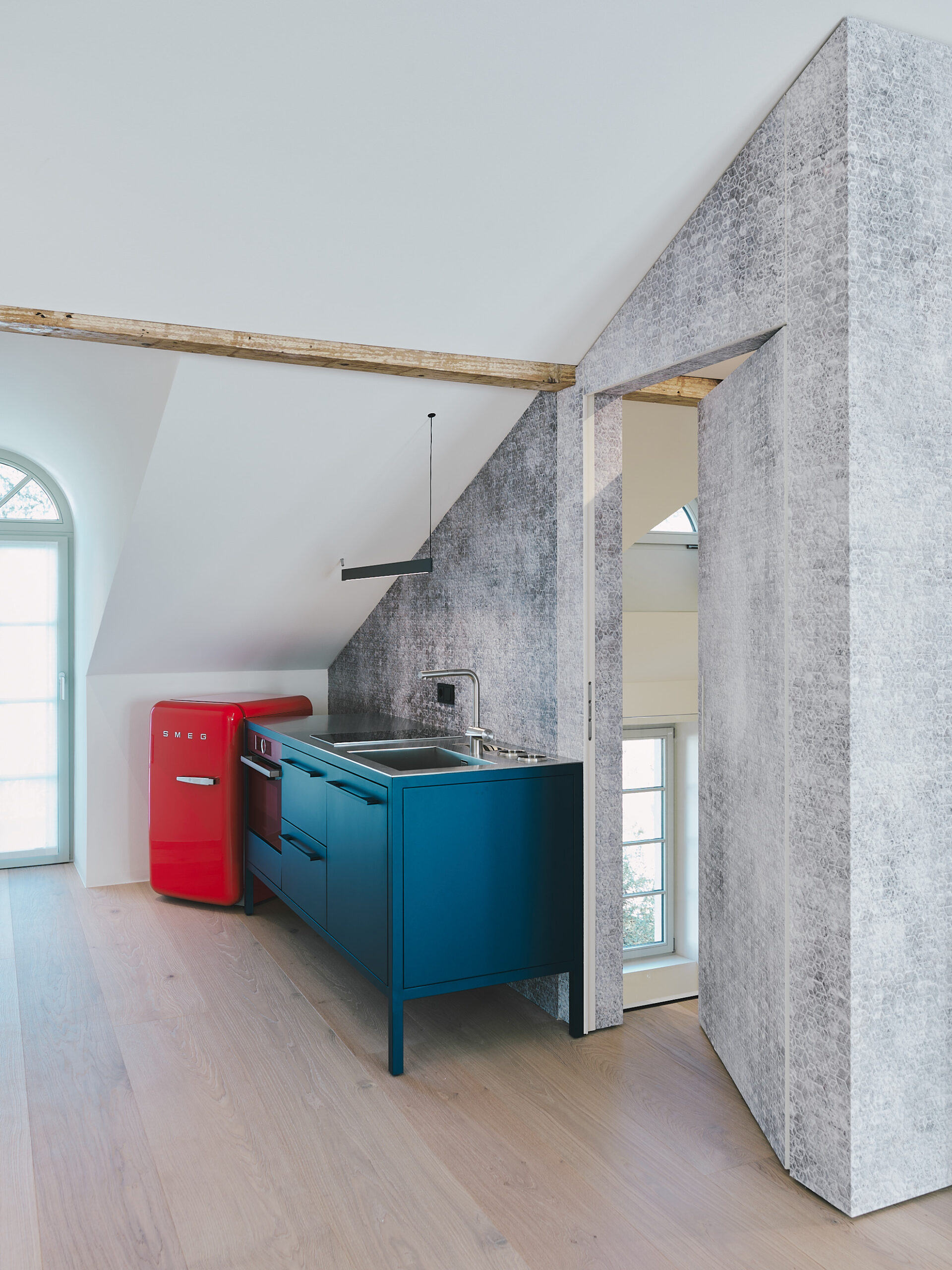 Im Dachgeschoss entsteht eine intime Dependance mit sichtbaren Holzbalken und minimalistisch definiertem Interieur.