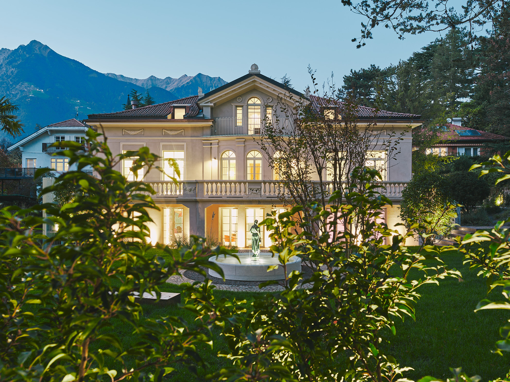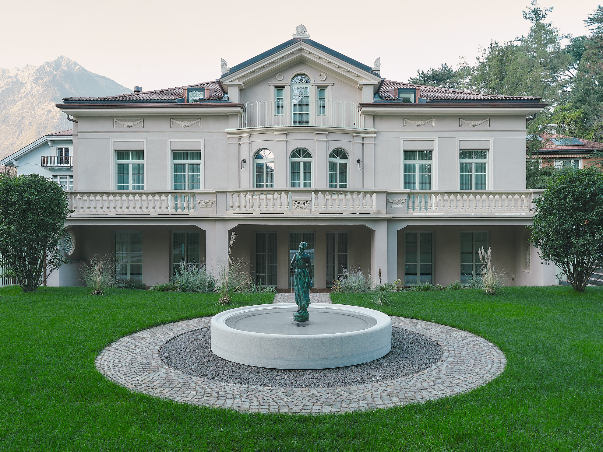 Der Garten wird behutsam überarbeitet. Wege und Höhenunterschiede führen natürlich zur zentralen Fontäne. Neue Beete folgen den Linien der Fassade und das Porphyrpflaster verankert das Projekt in der lokalen Tradition.