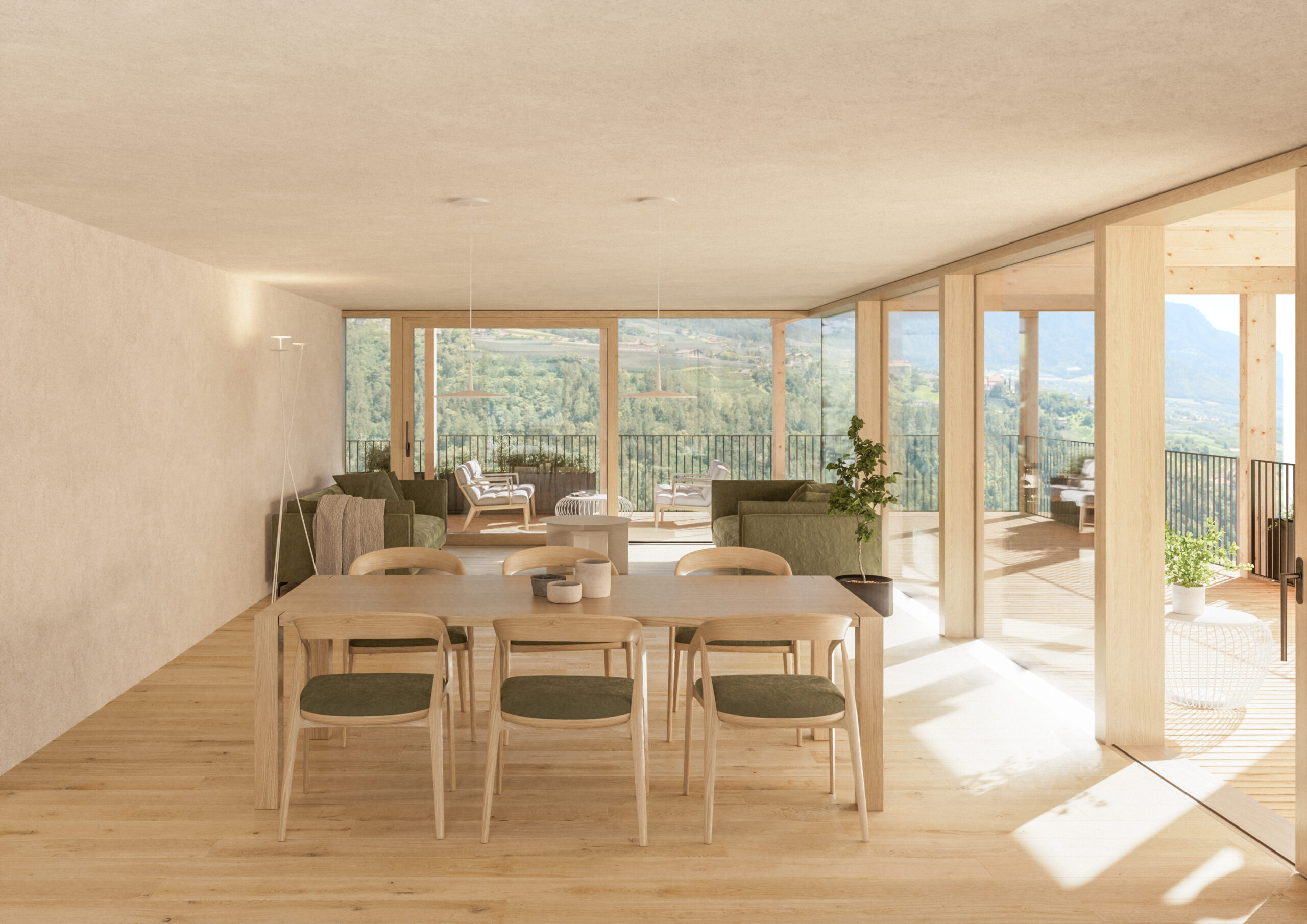 In the centre of Riffian, a small community in northern Italy, a new residential complex with 37 flats is to be built on a hillside. At the lower edge of the site there are two historic buildings along a busy road, the “Gasthaus Kreuz” and a barn belonging to it.