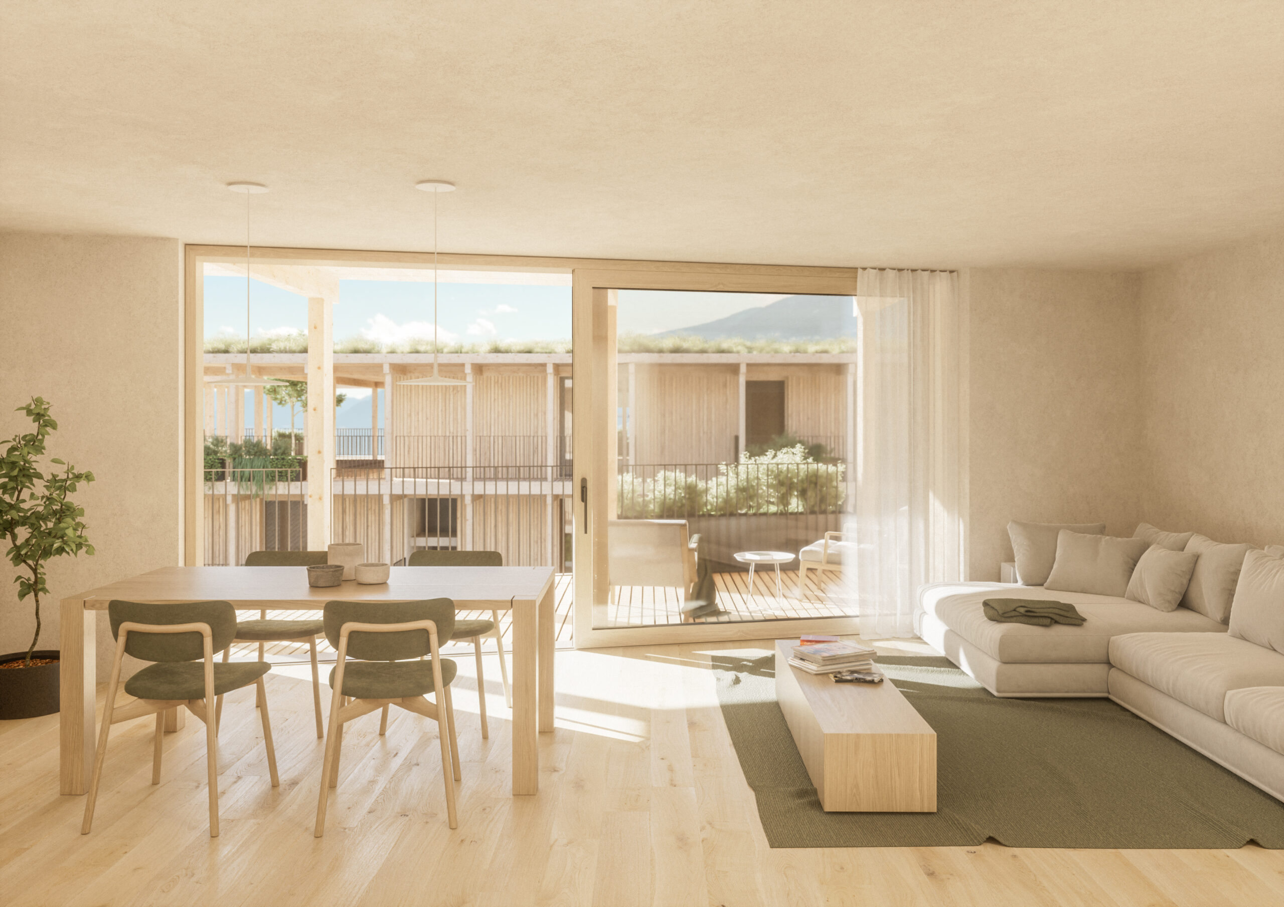 The building lines of the two existing buildings are taken up and continued in the positioning of the structures. This creates a harmonious overall structure. The new buildings between three and six storeys are chosen in such a way that the scale of the characteristic built environment is maintained. They take into account the uniform settlement form of the rural surroundings and at the same time allow ideal lighting of the rooms as well as an unobstructed view for all residential units.
