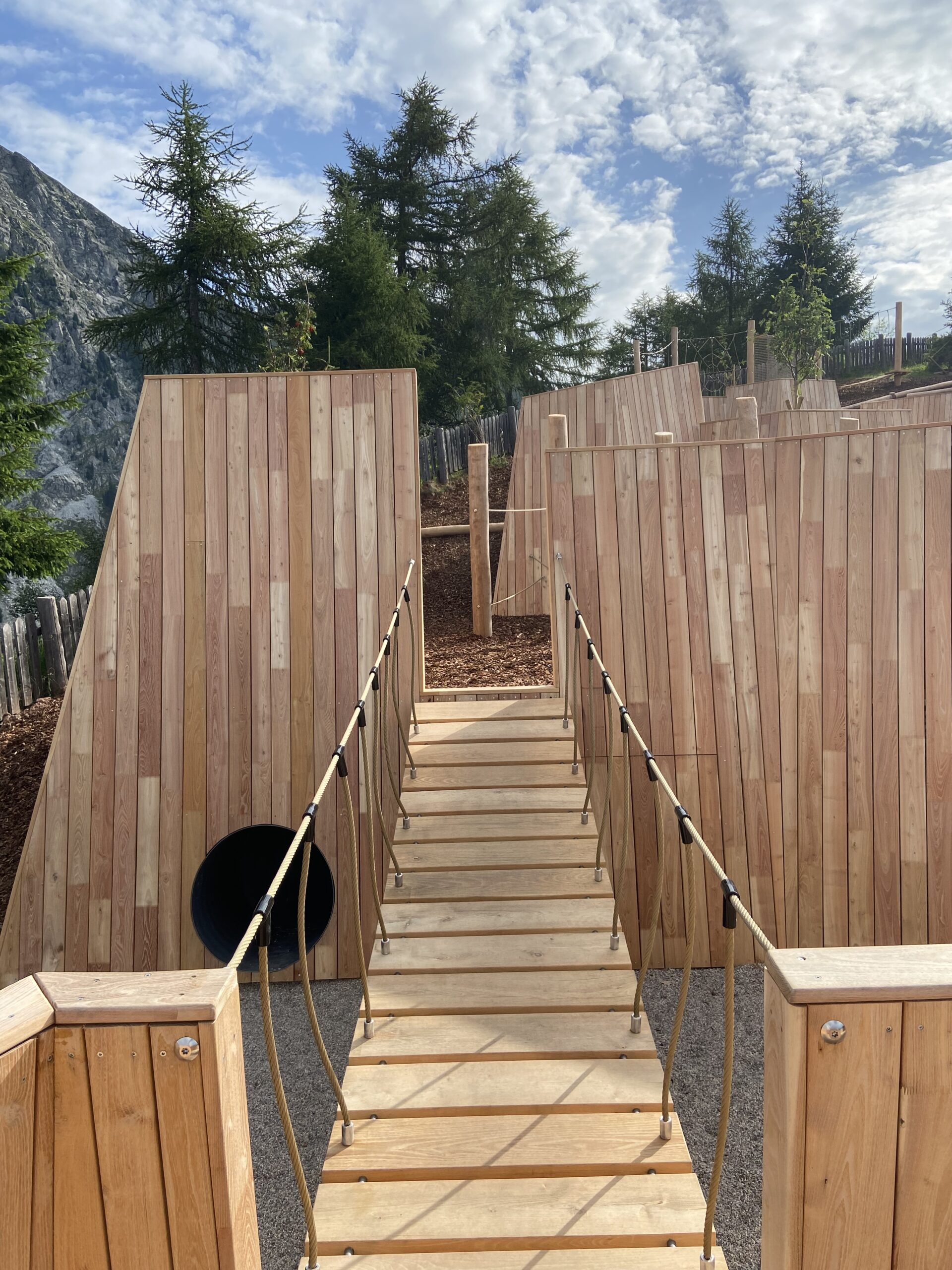 L’Outdoor Kids Camp risulta un insieme organico, un paesaggio ludico in armonia con il paesaggio unico di Merano 2000.