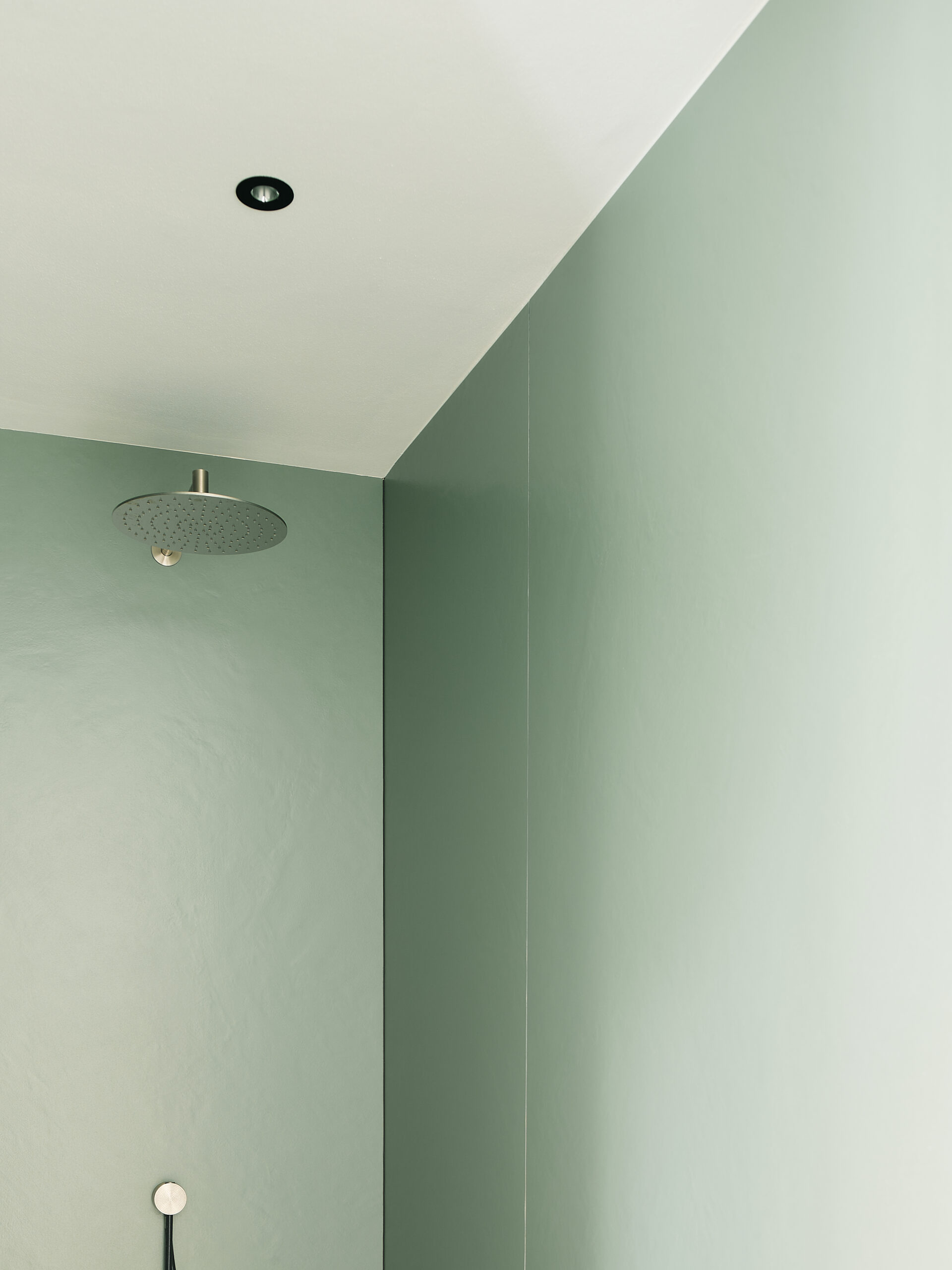 Qui lo spazio diventa dinamico e vivace grazie all’uso del colore, a green feld, che ritrova anche nelle grandi lastre della doccia e nella carta floreale in camera da letto, gli elementi illuminanti rimangono neri creando definiti punti di contrasto , mentre l’uso del legno rovere crea connessione con il piano superiore.Salendo si arriva al piano principale, dove lo spazio si amplia nella grande cucina che gira intorno ad un’isola centrale in fenix nero di 1.6m*2.4m, che insieme a tutta la zona giorno affaccia sull’enorme terrazza che guarda Merano. Una finestra che verso est diventa così una nicchia in legno dove sedersi a leggere guardando il panorama. Qui l’atmosfera diventa elegante grazie dall’uso del nero e bianco, illuminati da lampade cromate e riscaldate dai dettagli in legno rovere. Un colore antracite definisce la zona notte, con la sua lunga cabina armadio, dove nascosta in un’anta si apre la porta che al bagno privato, mentre il parquet a spina di pesce caratterizza la zona del letto.Partendo dal garage e passando per i 3 piani descritti, l’elemento protagonista nonché di connessione è il vano scale, caratterizzato da una linea luminosa intagliata nel legno come corrimano che guida gli ospiti nella salita.