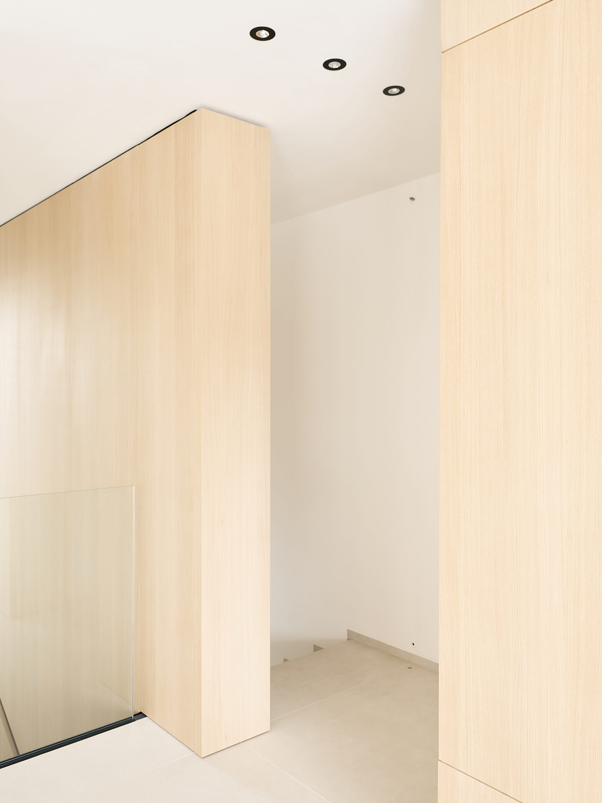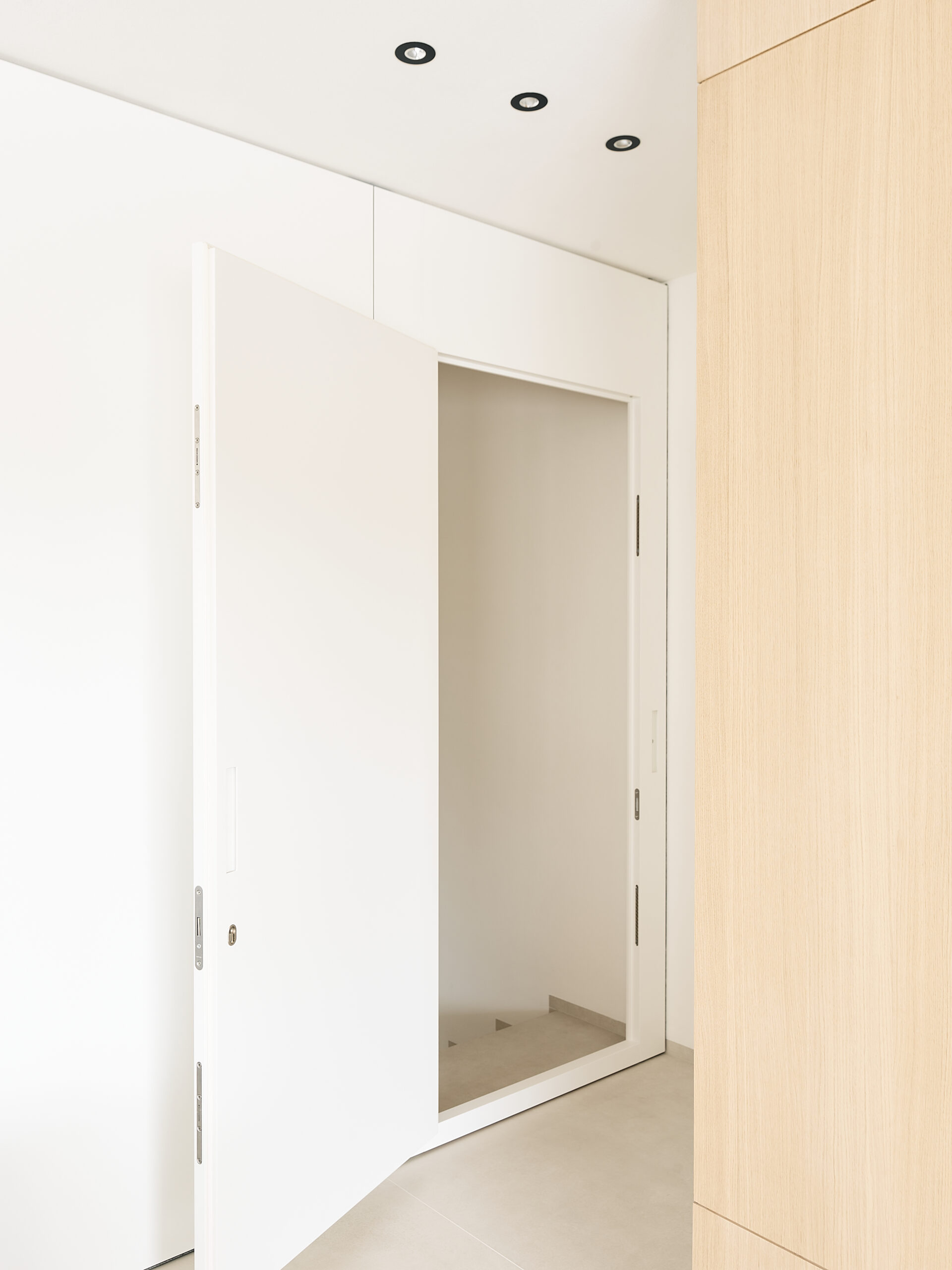 Al piano primo si trova una sorta di dependance del piano secondo, per lo spazio di ufficio e la zona sauna, entrambi con grandi vetrate che guardano direttamente sul giardino con piscina, creando un forte legame con l’esterno. L’appartamento con spazi minimi ma completi anche di zona pranzo e camera da letto, può essere eventualmente reso indipendente per ospiti, grazie ad porta rotante disegnata su misura che sparisce nell’arredo del vano scale al piano superiore.